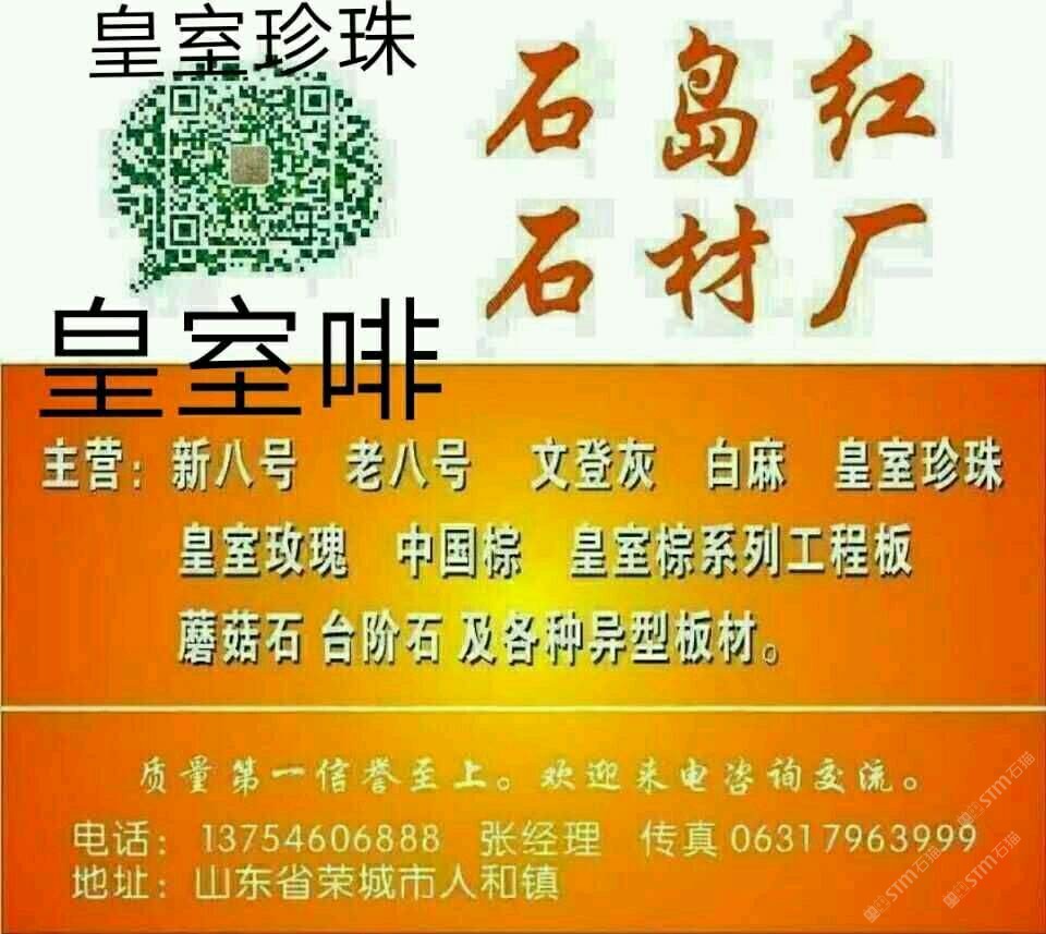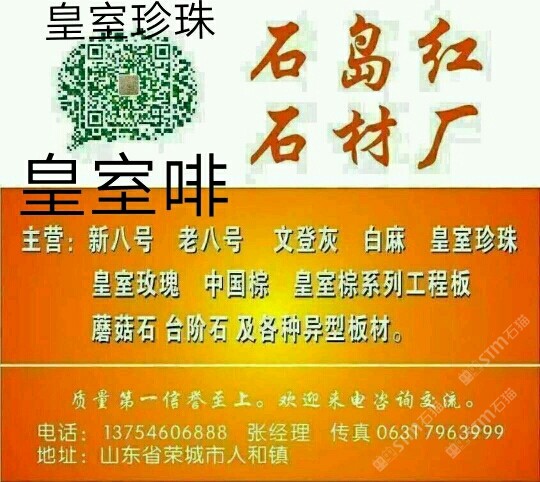 該企業(yè)尚未填寫簡(jiǎn)介,請(qǐng)補(bǔ)充!山東石島紅石材廠主營(yíng) 新八號(hào) 老八號(hào) 文登灰 白麻 皇室珍珠 皇室玫瑰 中國(guó)棕 皇室宗系列工程板 蘑菇石 臺(tái)階石 及各種異型板材。質(zhì)量信譽(yù)至上。歡迎來電咨詢交流。電話 13754606888 張經(jīng)理 傳真 0631 7963999。 qq 245382641 山東省榮城市人和鎮(zhèn)石材工業(yè)園666如不在線,請(qǐng)電話聯(lián)系 小規(guī)格園林板材庫存量大 價(jià)格低