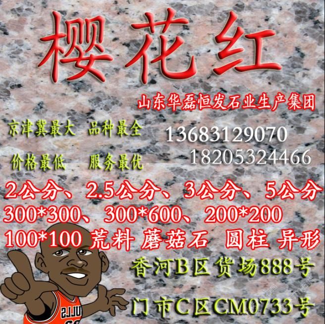山東華磊恒發(fā)石業(yè)始建于1999年,擁有白麻礦山,櫻花紅礦山,先進的機器設備,近年又投資乳山灰礦山,年加工石材5000立方,產(chǎn)品出口歐美日韓。公司宗旨,以質(zhì)量求生存,歡迎新老客戶光臨指導。