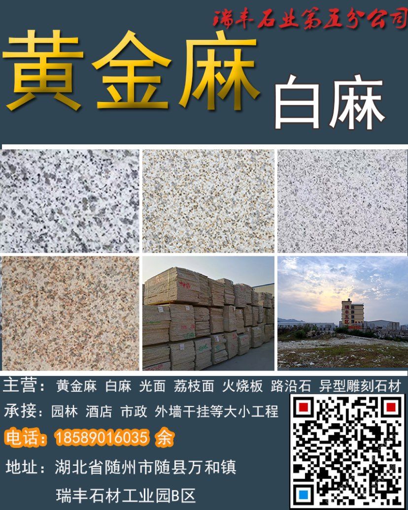 礦廠直銷;黃金麻,白麻,路沿石,蘑菇石,火燒面,光面,荔枝面,機切面,自然面,異形加工等各種規(guī)格板材。承接園林,廣場外墻干掛等各種工程應用板材。規(guī)格齊全,保質保量,歡迎新老客戶來電下單。18589016035