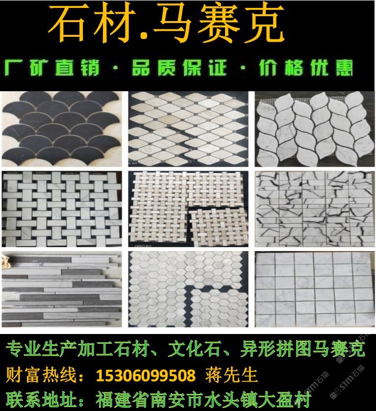 廈門摩恩石材馬賽克工廠是生產(chǎn)馬賽克、大理石、拼花、石線等石材的專業(yè)工廠,工廠成立15年誠信合作,價格公道,以質(zhì)量求生存,歡迎來廠參觀、詢價、考察下單。我們的工廠負(fù)責(zé)人蔣先生隨時恭候您的光臨,電話:15306099508,微信:15306099508 qq:1043118173