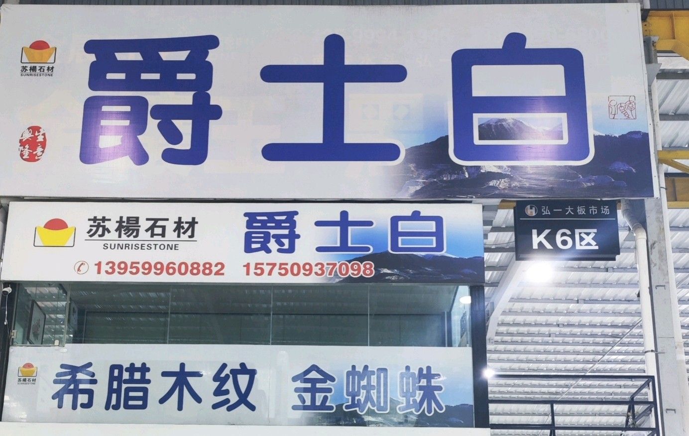 中國(guó)福建南安水頭弘一大板市場(chǎng)二期K6區(qū)(爵士白、威尼斯白、金蜘蛛、希臘白木紋、鎏金白玉)