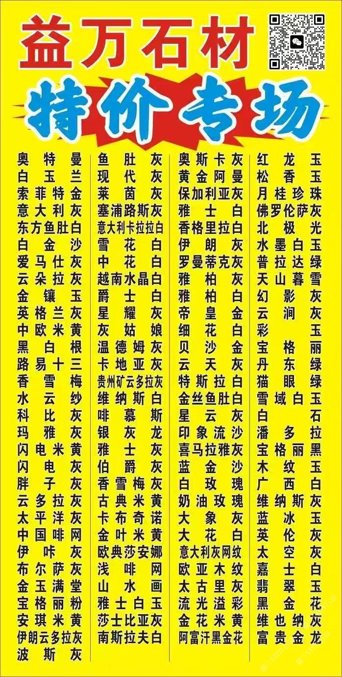 福建水頭益萬石材 【10000多平方精品1.5厚奧特曼]78元到138元任挑 【5000平方老葉愛馬仕灰】58元到88元任挑 【3000平方冠瑞礦愛馬仕灰】118元任挑 【5000平方星耀灰】88元任挑 【3000平方精品啊忠礦愛馬仕灰】108元任挑 【10000多平方黑白根】48元到63元任挑 【10000多平方土耳其老礦塞浦路斯灰】78元任挑 【1000平方意大利黑】58元任挑 【4000平方廣東礦愛馬仕灰】68元108元任挑 【2000平方金葉,金世紀(jì)米黃1.8足厚】78元任挑 【3000平方印度藍金沙,紫羅蘭】108元任挑 【20000平方香雪梅,水云紗】128元到188元任挑 【2000平方土耳其云朵拉灰】108元任挑 【2800平方魚肚灰】68元任挑 【5000平方廣西白,白金沙】98元任挑 【3000平方老礦精品白玉蘭】1.8厚1.6厚138元任挑 【20000平方1.8足厚新切精品,塞浦路斯灰,比薩灰,意大利灰】48元到88元任挑 【2000平方新奧特曼灰】68元任挑 【3000平方胖子灰】98元任挑 【2000平方爵士白】128元任挑 以上品種基本上都是新磨的料 專業(yè)為您家裝工裝《保價護航》只要您看上的板價格包您滿意,本公司承諾石材有瑕疵提前告知,如不告知有問題包退換。 加這個號??15159705556呂微信同號,關(guān)注?我微信,少花錢,有需要樣品的來,免費寄樣品。