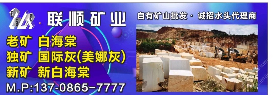 聯(lián)順礦業(yè) 聯(lián)系人:鄭先生    137****7777 查看 137****7777 查看 主營范圍: 礦山、荒料、大板批發(fā)、 企業(yè)地址:福建南安水頭鎮(zhèn)新寰宇石業(yè)2號門進,聯(lián)順礦業(yè)白海棠專場