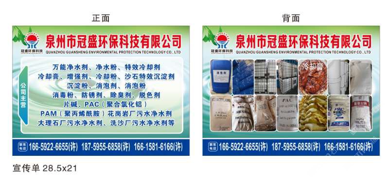 發(fā)布信息: 冠盛環(huán)??萍?8759556858 主營產(chǎn)品:凈水劑,冷卻劑,冷卻粉,大理石人造石專用凈水劑,沉淀粉,消泡劑,消毒凈水劑,防銹凈水劑,除銹劑,除臭劑,聚丙烯酰胺,聚合氯化鋁,鹵精,洗沙專用凈水劑,壓濾機(jī)專用凈水劑,陶瓷廠專用凈水劑(黃藥 白藥)等所有水處理環(huán)保材料……