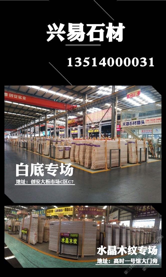 發(fā)布信息: ? ? ? 【興易大理石】 ? ? 白底水晶木紋專場 ? 我司主營水晶木紋系列產(chǎn)品: 水晶木紋,翡翠木紋,國產(chǎn)藍金沙,白金沙,彩虹木紋 ? 滿倉白底水晶木紋新料任選, 條板,大板 荒料均有售,統(tǒng)一花色,防水背膠供應(yīng)! 部分礦口特惠,歡迎撿漏 歡迎新老客戶來電垂詢! ? ?地址: ? 濱海高時物流一號館大門旁 ? 創(chuàng)安c區(qū)c7區(qū)興易石材 ? 電話:13514000031小李 ? ?